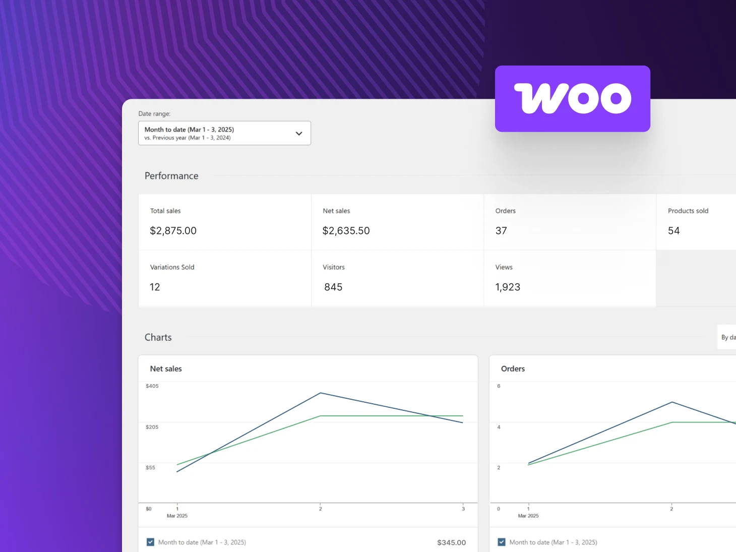 WooCommerce performance dashboard showing March 2025 data with $2,875 total sales, 37 orders, and line charts comparing current metrics with previous year.